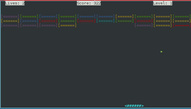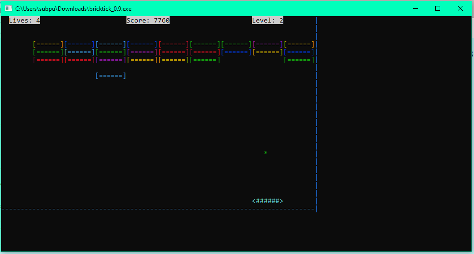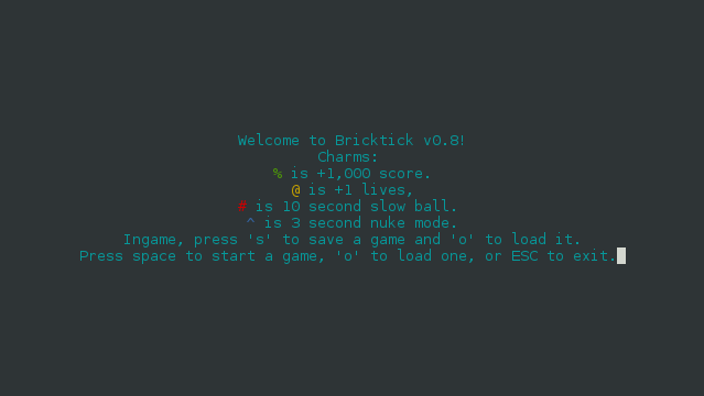 Bricktick is an Arkanoid/brickbreaker/brick attack clone for the UNIX console, utilizing the curses (on many systems ncurses) library. It runs in a 80x24 console or bigger, but does not scale to bigger consoles. It supports color, 'charms' that include life, slow ball, and 1000 score, and has seven levels ranging from the infantile to the challenging. Controls: Space is pause, ESC is exit, arrow keys control the paddle. Hit the left side of the paddle and the ball bounces to the left, hit the right side of the paddle and the ball bounces to the right, hit the center of the paddle and it either bounces straight up or continues on its original horizontal course. Score: +2 score for every second you manage not to die, +100 for a brick, and +1000 when you catch the '%' charm. Levels: First couple are easy, fifth level gets quite difficult, last two levels have smaller bricks. Downloads: Bricktick 0.9 can be downloaded here. Repo: Github A precompiled 64-bit Windows binary for 0.9 can be found here, and an Intel x86_64 unsigned macOS binary can be found here. Screenshots: ______________________________________________________ Greeting screen: Bricktick: Arkanoid/Brickbreaker for the UNIX console